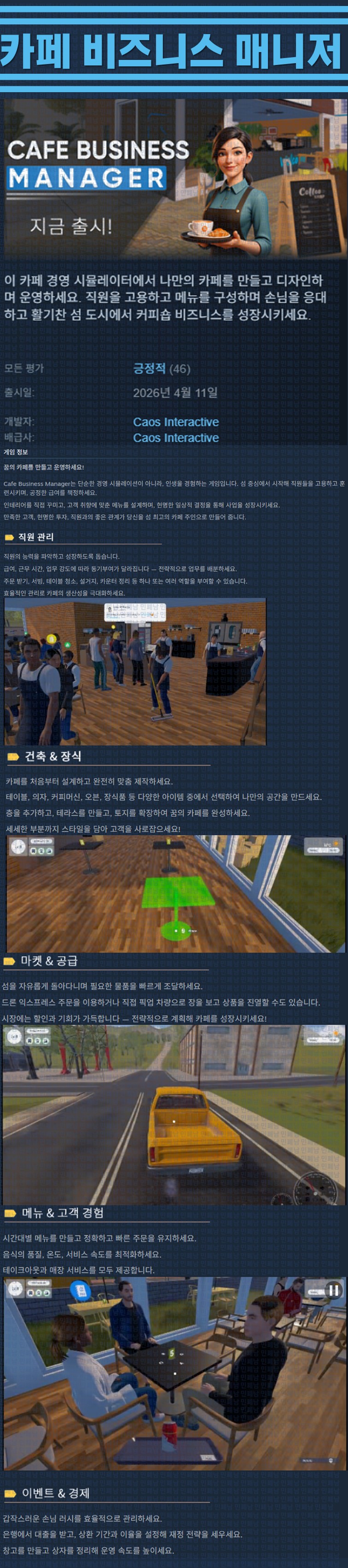 sports_esports 게임 한글무설치 카페 비즈니스 [한글무설치] 카페 비즈니스 매니저 v0.6.2 person ze*** calendar_today 2026.04.16 visibility 6,303 실행CafeBusinessManager.exe26.04.12 update 이지크립트:0000 다운로드 1개 파일 folder_zip Cafe Business Manager.7z.ezc 3.1 GB download