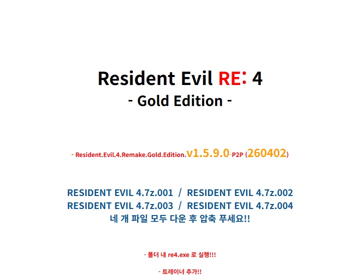sports_esports 게임 NEWAYZ 레OO트 이O [NEWAYZ] 레OO트 이O 4 리메이크 person ne*** calendar_today 2026.04.16 visibility 3,228 - 복호화 비번: 4321- https://store.steampowered.com/app/2050650/BIOHAZARD_RE4/ - 구동 확인 - 다운로드 4개 파일 folder_zip RESIDENT EVIL 4.7z.001.ezc 66.3 GB download folder_zip RESIDENT EVIL 4.7z.002 download folder_zip RESIDENT EVIL 4.7z.003 download folder_zip RESIDENT EVIL 4.7z.004 download auto_awesome 관련 포스트 게임 [NSW] 크립트 카니지 (Crypt Carnage) 킹애***4,239 views 게임 [NSW] 다크 라이트 (Dark Light) 킹애***6,695 views 게임 [NSW] 데드 스트라이드 (Dead Stride) 킹애***6,496 views forum 댓글 send 댓글 등록 sports_esports 게임 목록 전체보기 → progress_activity