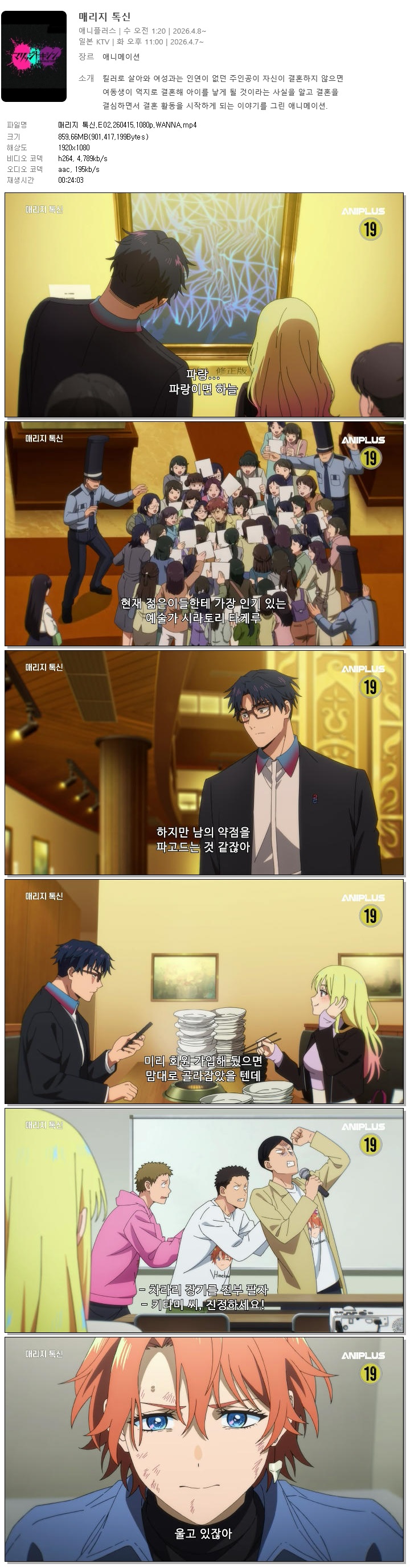 auto_awesome 애니 매리지 톡신 E02 매리지 톡신.E02.260415.1080p.WANNA person 홀리*** calendar_today 2026.04.16 visibility 7,650 다운로드 1개 파일 folder_zip 매리지 톡신.E02.260415.1080p.WANNA.mp4 860 MB download
