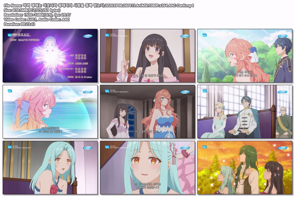 auto_awesome 애니 악역 영애는 이웃나라 악역 영애는 이웃나라 왕태자의 사랑을 듬뿍 받는.. person da*** calendar_today 2026.04.16 visibility 5,787 다운로드 1개 파일 folder_zip 악역 영애는 이웃나라 왕태자의 사랑을 듬뿍 받는다.2026.EP08.260415.AniMX.1080P.x264.AAC-DarK.mp4 870 MB download