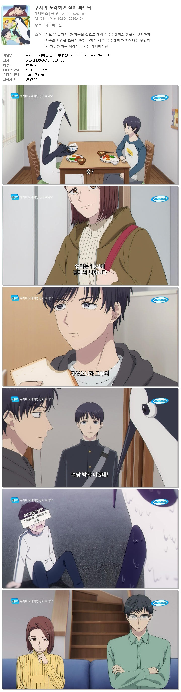 auto_awesome 애니 쿠지마 노래하면 집이 쿠지마 노래하면 집이 파다닥.E02.260417.720p.WANNA person 바오*** calendar_today 2026.04.16 visibility 3,757 다운로드 1개 파일 folder_zip 쿠지마 노래하면 집이 파다닥.E02.260417.720p.WANNA.mp4 548 MB download