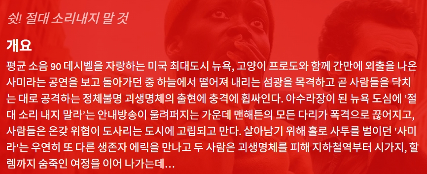 movie 영화 콰이어트 플레이스 첫째 콰이어트 플레이스- 첫째 날 "쉿! 절대 소리내지 말 것" person gg*** calendar_today 2026.04.17 visibility 5,041 다운로드 1개 파일 folder_zip 콰이어트 플레이스- 첫째 날.mkv 1.2 GB download
