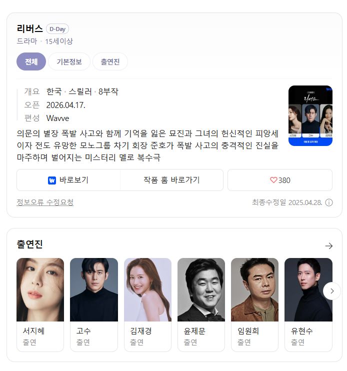 tv 드라마 리버스 02화 고수 리버스.01~02화(고수,서지혜).1080p.WAVVE.WEB-DL-MrHulk person 켓츠*** calendar_today 2026.04.17 visibility 3,992 다운로드 2개 파일 folder_zip Reverse.S01E01.1080p.WAVVE.WEB-DL.AAC2.0.H.264-MrHulk.mkv 3.8 GB download folder_zip Reverse.S01E02.1080p.WAVVE.WEB-DL.AAC2.0.H.264-MrHulk.mkv download