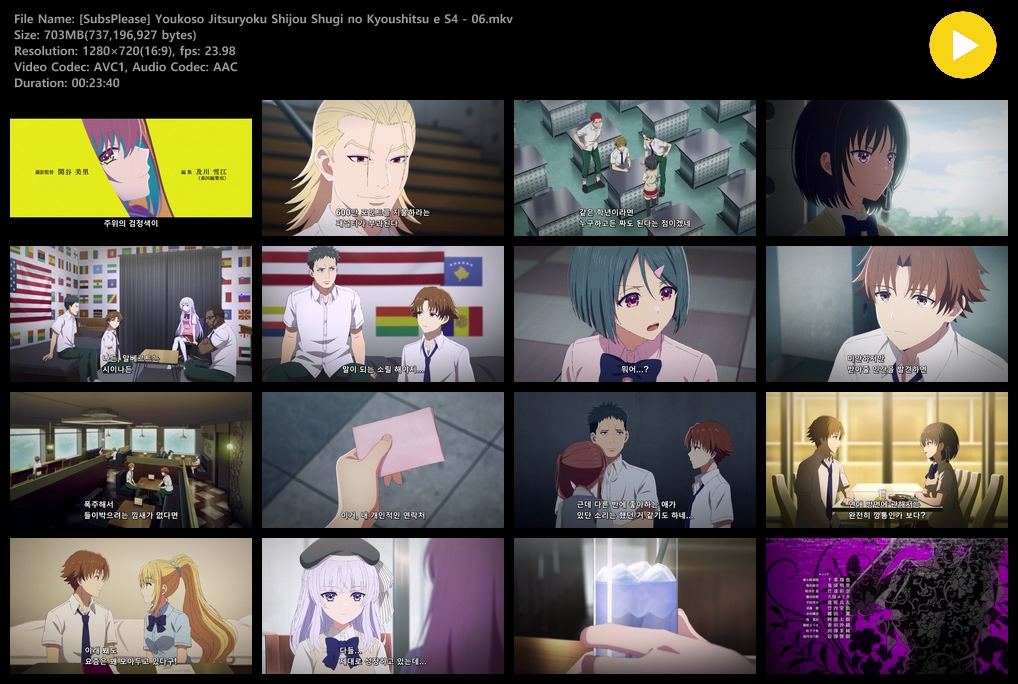 auto_awesome 애니 어서 오세요 실력지상주의 어서 오세요 실력지상주의 교실에 4기 (2026) - 06 (1280x720) person zz*** calendar_today 2026.04.17 visibility 7,281 다운로드 2개 파일 folder_zip [SubsPlease] Youkoso Jitsuryoku Shijou Shugi no Kyoushitsu e S4 - 06.mkv 703 MB download folder_zip [SubsPlease] Youkoso Jitsuryoku Shijou Shugi no Kyoushitsu e S4 - 06.srt download
