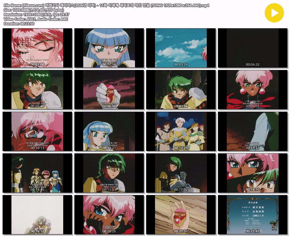 auto_awesome 애니 공식자막 마법기사 레이어스 [공식자막] 마법기사 레이어스 - 11화 이세계 세피로의 마신 전설 person 이샤*** calendar_today 2026.04.17 visibility 4,011 다운로드 1개 파일 folder_zip 마법기사 레이어스(2026년 자막) - 11화 이세계 세피로의 마신 전설 (TVING 1920x1080 x.264 AAC).mp4 1,021 MB download