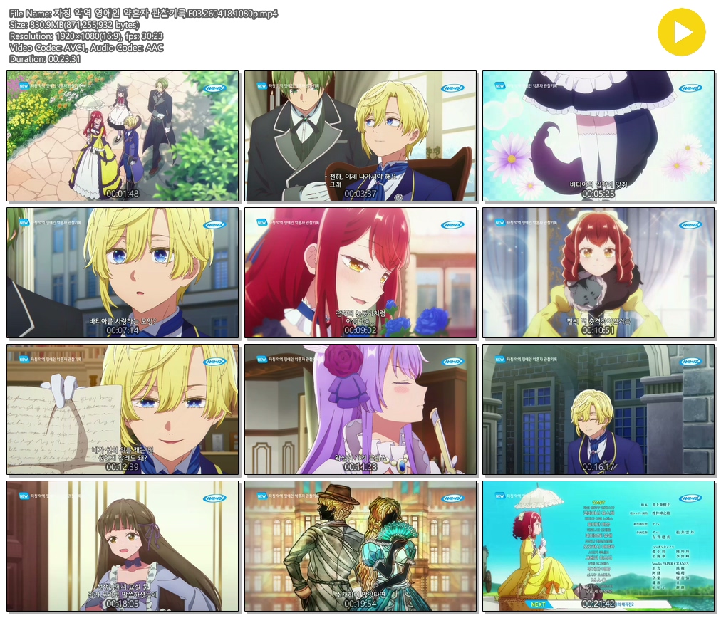 auto_awesome 애니 ANIPLUS 자칭 악역 [ANIPLUS] 자칭 악역 영애인 약혼자 관찰기록 - 03 (1920x1080) person 에어*** calendar_today 2026.04.17 visibility 4,388 다운로드 1개 파일 folder_zip 자칭 악역 영애인 약혼자 관찰기록.E03.260418.1080p.mp4 831 MB download