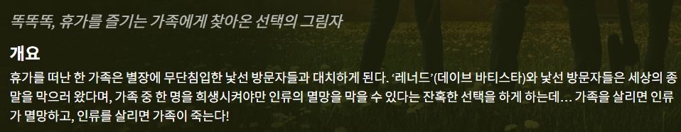 movie 영화 똑똑똑 인류의 종말인가 똑똑똑 "인류의 종말인가, 가족의 희생인가! 낯선 방문객들이 던진 잔혹한 선택의 기록" person gg*** calendar_today 2026.04.18 visibility 7,023 다운로드 1개 파일 folder_zip 똑똑똑.mkv 1.2 GB download