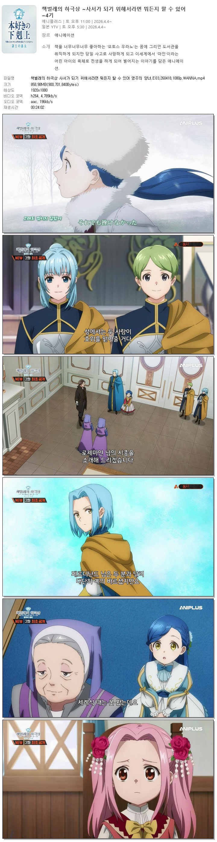 auto_awesome 애니 책벌레의 하극상 사서가 책벌레의 하극상 사서가 되기 위해서라면 뭐든지 할 수 있어 영주의 양녀.E03.260418.1080p.WANNA person 홀리*** calendar_today 2026.04.18 visibility 4,678 다운로드 1개 파일 folder_zip 책벌레의 하극상 사서가 되기 위해서라면 뭐든지 할 수 있어 영주의 양녀.E03.260418.1080p.WANNA.mp4 859 MB download