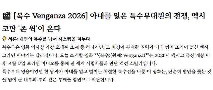 movie 영화 복수자 카르텔과 군부의 [복수자] 카르텔과 군부의 유착 아내의 죽음 복수의 시작 자체자막 person pk*** calendar_today 2026.04.19 visibility 7,637 다운로드 1개 파일 folder_zip 복l수l자.mkv 1.9 GB download