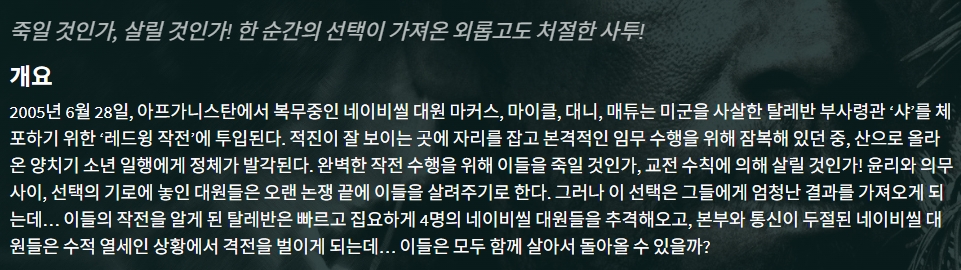 movie 영화 서바이버 죽일 것인가 론 서바이버 "죽일 것인가, 살릴 것인가! 한 순간의 선택이 가져온 외롭고도 처절한 사투!" person gg*** calendar_today 2026.04.20 visibility 4,284 다운로드 2개 파일 folder_zip 론 서바이버.mkv 2.8 GB download folder_zip 론 서바이버.srt download