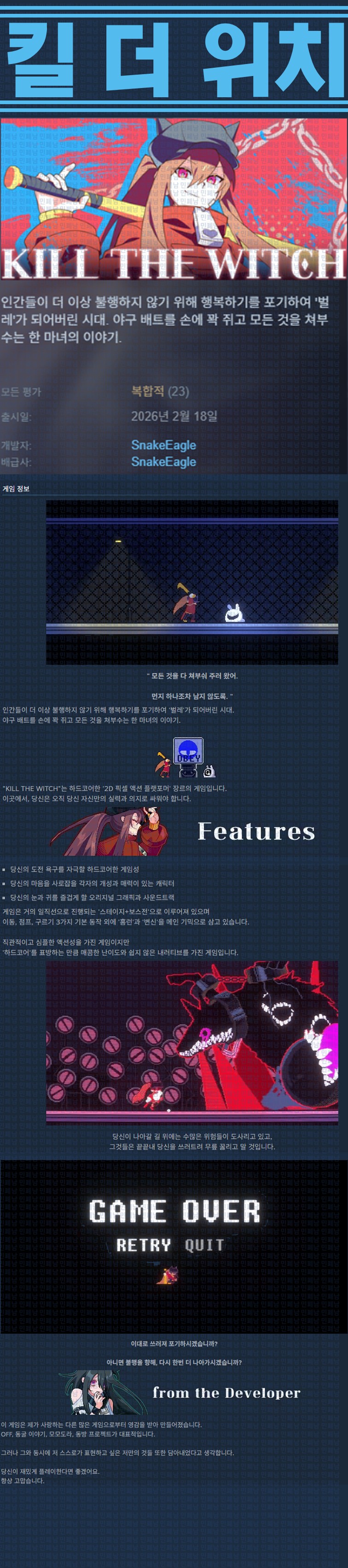sports_esports 게임 한글무설치 킬 더 [한글무설치] 킬 더 위치 v1.0 person ze*** calendar_today 2026.01.01 visibility 5,146 실행KILL THE WITCH.exe26.02.18 신작 이지크립트:0000 다운로드 1개 파일 folder_zip KILL THE WITCH Build.21977040.zip 146 MB download