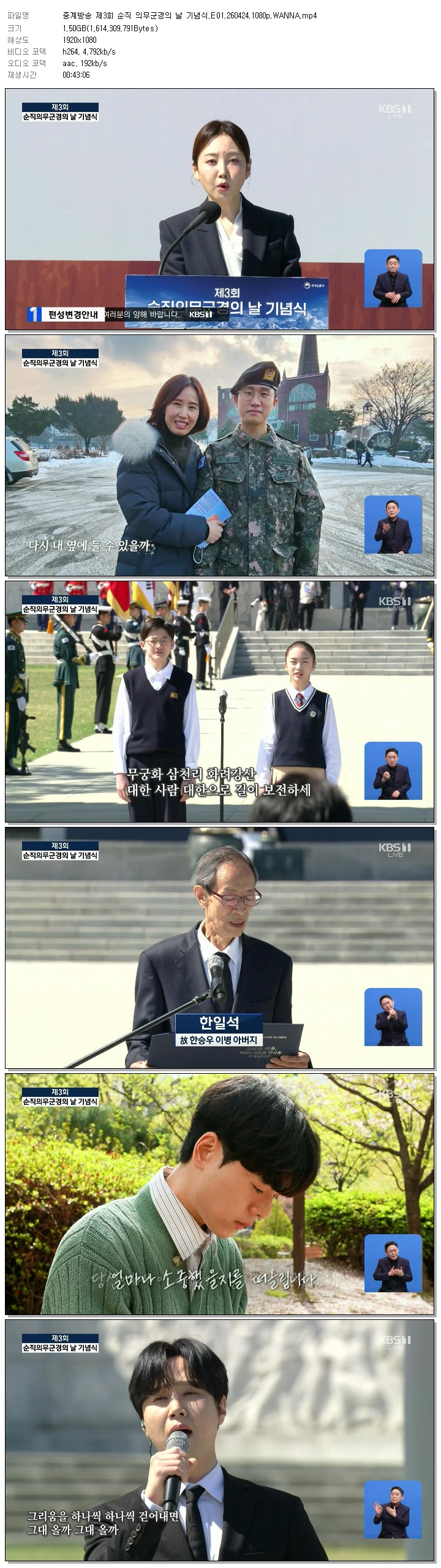 play_circle 동영상 중계방송 제3회 순직 중계방송 제3회 순직 의무군경의 날 기념식.E01.260424.1080p.WANNA person 홀리*** calendar_today 2026.04.24 visibility 3,326 다운로드 1개 파일 folder_zip 중계방송 제3회 순직 의무군경의 날 기념식.E01.260424.1080p.WANNA.mp4 1.5 GB download