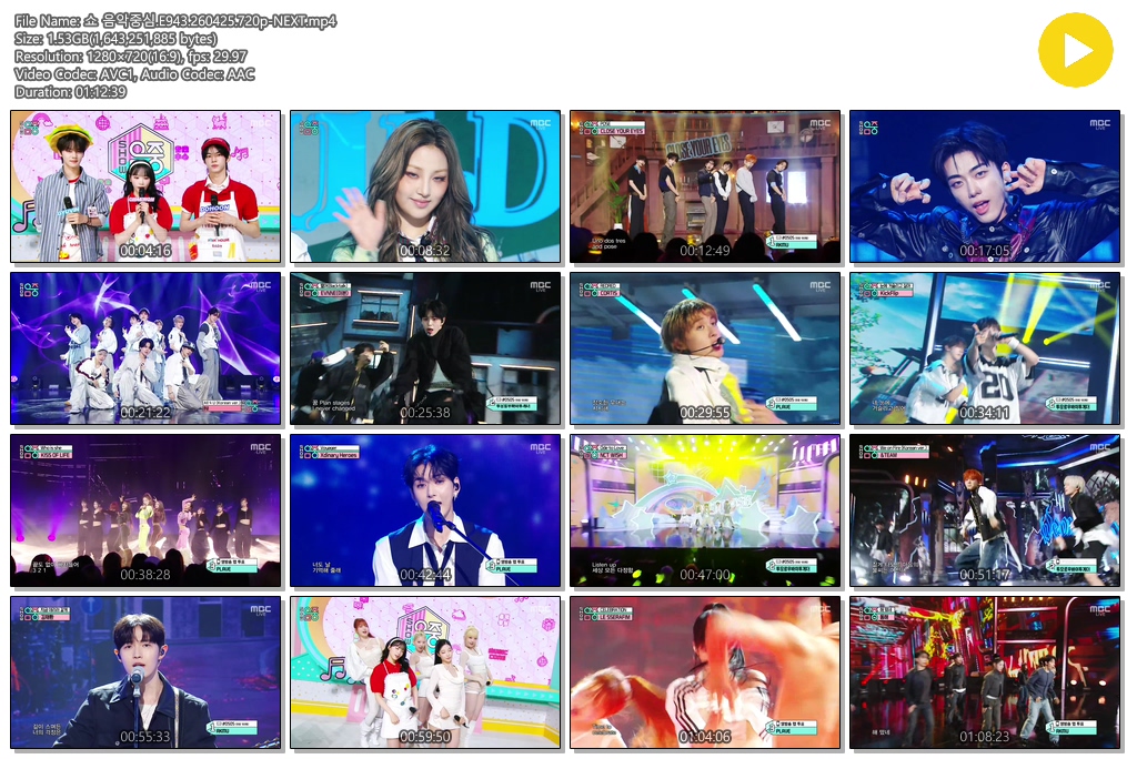 play_circle 동영상 음악중심 E943 NEXT 쇼 음악중심.E943.260425.720p-NEXT person se*** calendar_today 2026.04.26 visibility 5,723 다운로드 1개 파일 folder_zip 쇼 음악중심.E943.260425.720p-NEXT.mp4 1.5 GB download