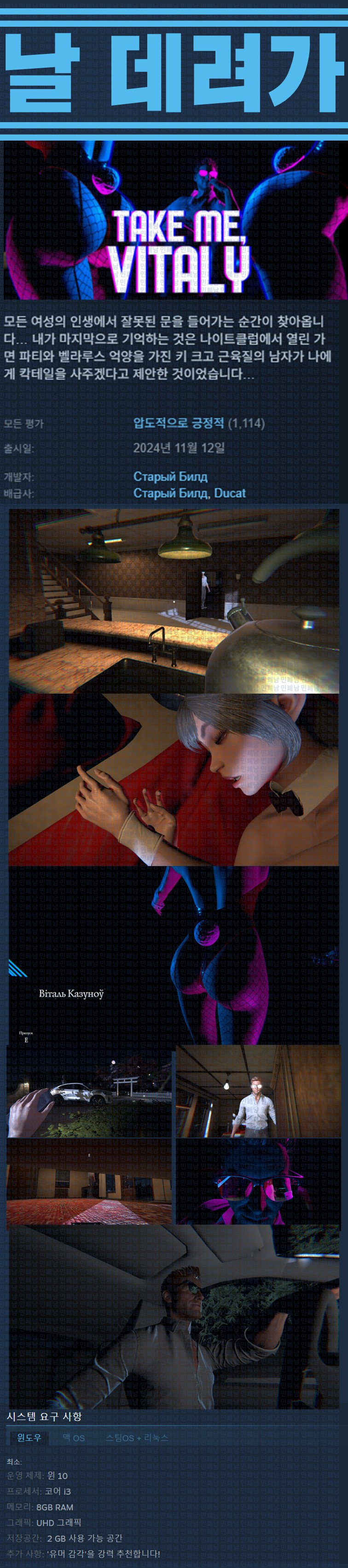 sports_esports 게임 한글무설치 날 데려가 [한글무설치] 날 데려가 v1.3.1 person ze*** calendar_today 2026.01.01 visibility 5,072 실행TakeMe.exe26.02.04 update 이지크립트:0000 다운로드 1개 파일 folder_zip Take Me Vitaly.7z 1.9 GB download