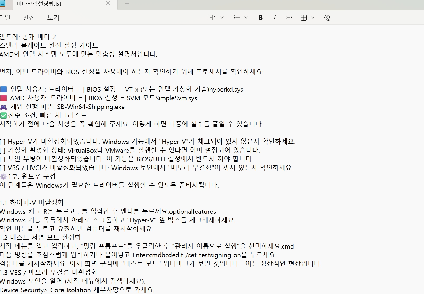 이것만 필요한분들이 있을까봐 따로 올려놓습니다. 링크 영상있고 이거는 AI번역으로 한글로만들어 놔봣습니다. 이게 뭐가 어려운데 생각돼시는분들만 베타크랙 게임받으시면돼요. 절대 그냥은 받지마세요. 쌍욕밖에 안나올 정도록 더럽게 어려운방법이에요 베타크랙그나마 3.0이나 3.0이상 부터는 조금 쉬워는 졋는데. 엄청 위험하고 안정적이지 않는 방법입니다. 디펜더를 끈다 이런게아니라 메인보드 바이오스에서 보안관련해서 전부 꺼버린다이기때문에 극단적으로 위험하다고 생각들수있는방법입니다.링크세개다 보시면됌니다. 세가지 방법이 있어요.
