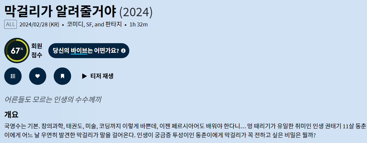 movie 영화 막걸리가 알려줄거야 아저씨 막걸리가 알려줄거야 "아저씨, 막걸리가요... 저보고 페르시아어를 배우래요. 이게 제 인생 숙제래요!" person gg*** calendar_today 2026.01.01 visibility 5,338 다운로드 1개 파일 folder_zip 막걸리가 알려줄거야(2024).mp4 1.4 GB download
