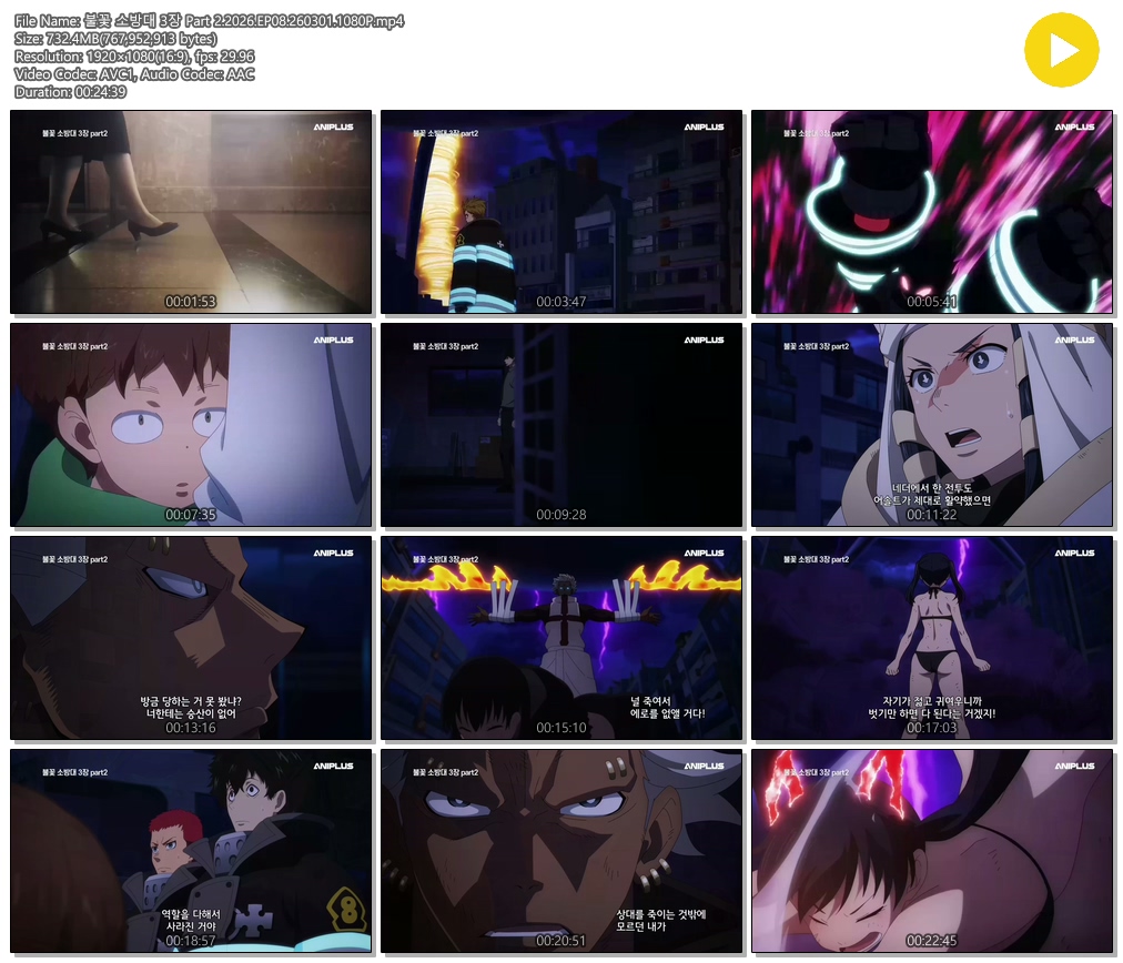 auto_awesome 애니 ANIPLUS 불꽃 소방대 [ANIPLUS] 불꽃 소방대 3기 2쿨 - 08 (1920x1080) person 에어*** calendar_today 2026.01.01 visibility 5,560 다운로드 1개 파일 folder_zip 불꽃 소방대 3장 Part 2.2026.EP08.260301.1080P.mp4 732 MB download