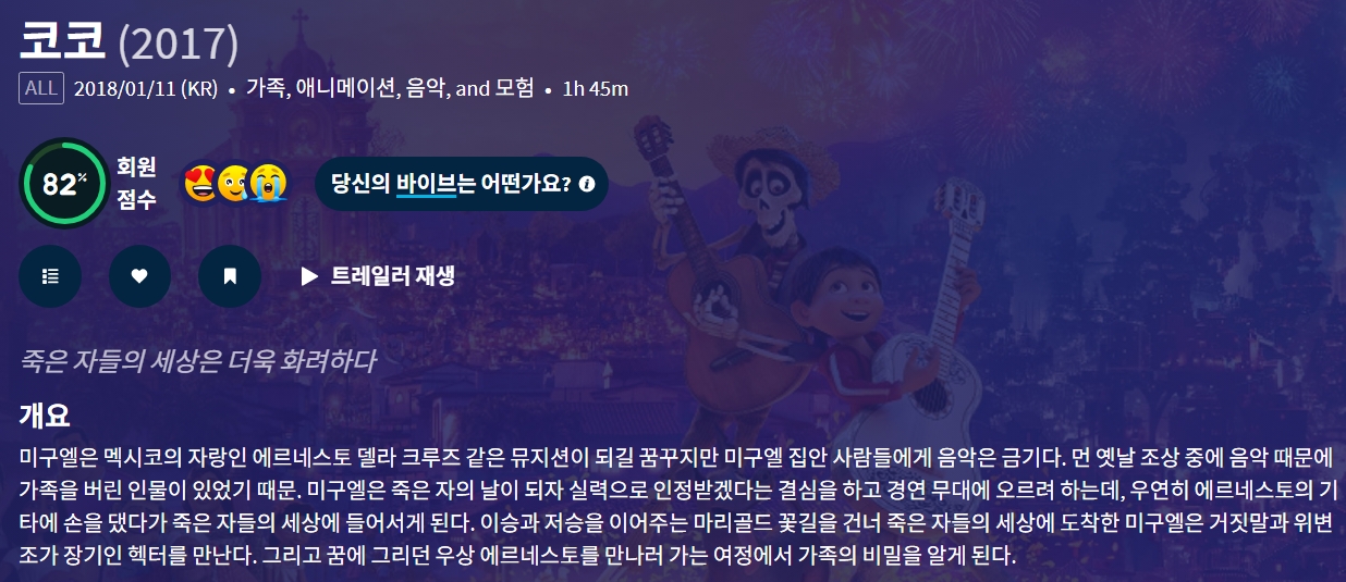 movie 영화 코코 더빙판 죽은 [코코 (더빙판)] 죽은 자들의 세상은 더욱 화려하다 person gg*** calendar_today 2026.03.28 visibility 6,598 다운로드 2개 파일 folder_zip [코코 (더빙판)].mp4 2.3 GB download folder_zip [코코 (더빙판)].srt download