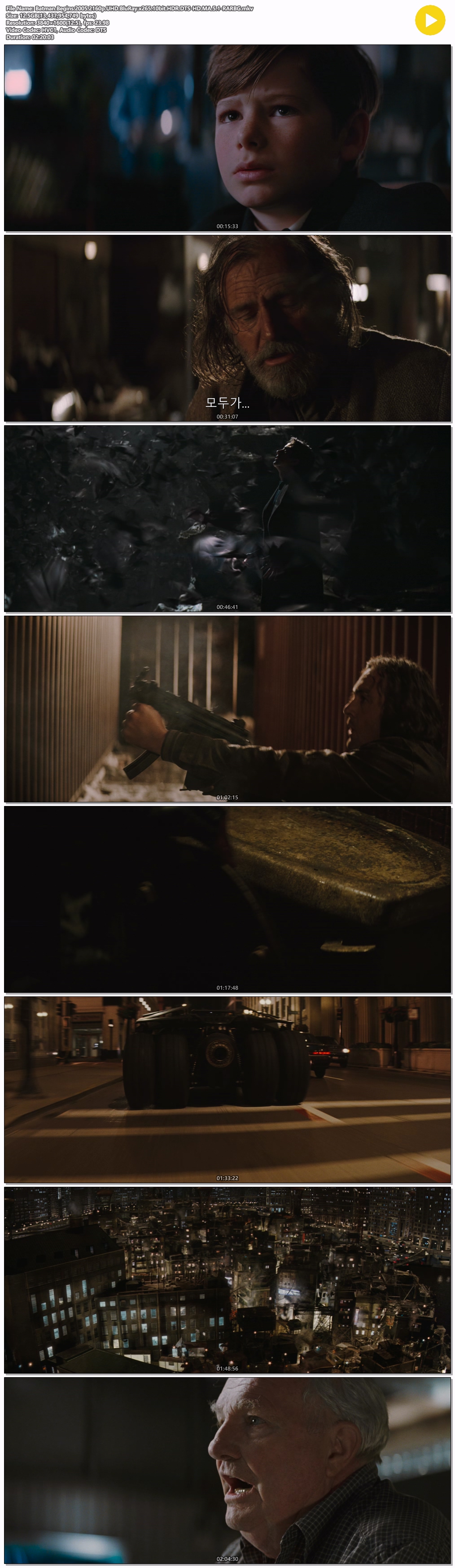 movie 영화 배트맨5 Begins 10bit [4K] 배트맨5 .Begins.2005.2160p.UHD.BluRay.x265.10bit.HDR.DTS-HD.MA.5.1 person ro*** calendar_today 2026.03.28 visibility 3,649 다운로드 2개 파일 folder_zip Batman.Begins.2005.2160p.UHD.BluRay.x265.10bit.HDR.DTS-HD.MA.5.1-RARBG.mkv 12.5 GB download folder_zip Batman.Begins.2005.2160p.UHD.BluRay.x265.10bit.HDR.DTS-HD.MA.5.1-RARBG.smi download