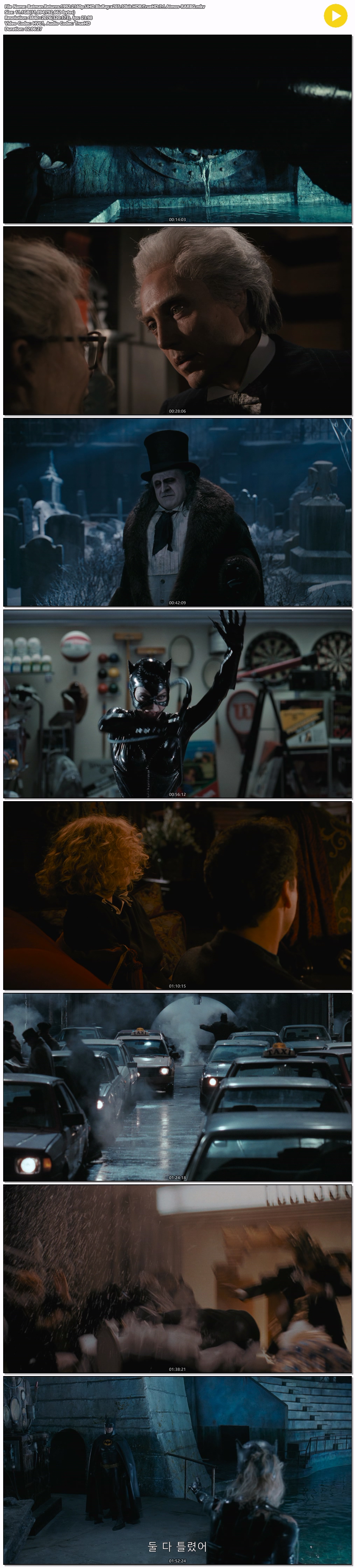 movie 영화 배트맨2 Returns 10bit [4K] 배트맨2 .Returns.1992.2160p.UHD.BluRay.x265.10bit.HDR.TrueHD.7.1 person ro*** calendar_today 2026.03.28 visibility 6,865 다운로드 2개 파일 folder_zip Batman.Returns.1992.2160p.UHD.BluRay.x265.10bit.HDR.TrueHD.7.1.Atmos-RARBG.mkv 11.1 GB download folder_zip Batman.Returns.1992.2160p.UHD.BluRay.x265.10bit.HDR.TrueHD.7.1.Atmos-RARBG.srt download