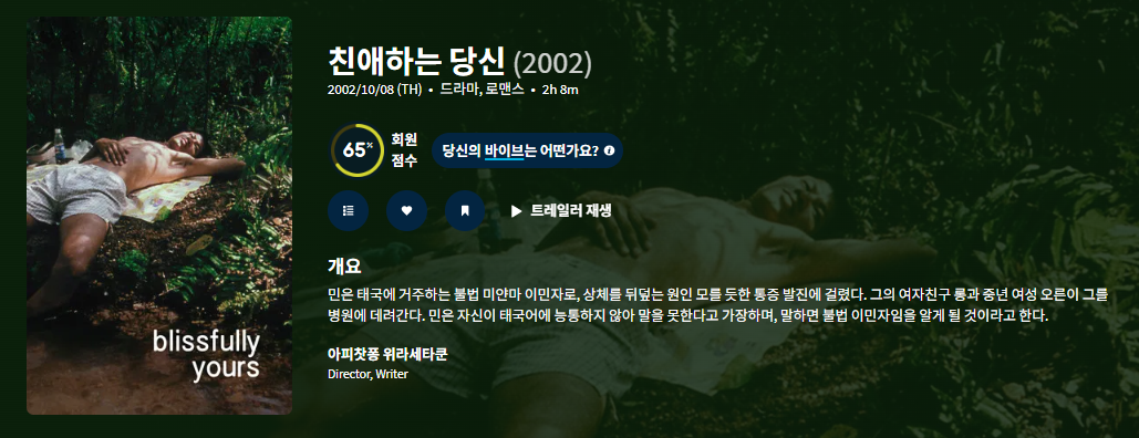 movie 영화 큐레이터 아피찻퐁 위라세타쿤 [큐레이터] 아피찻퐁 위라세타쿤 감독 [친애하는.. person ru*** calendar_today 2026.03.28 visibility 7,973 다운로드 2개 파일 folder_zip 친애하는당신.Blissfully.Yours.Sud.Sanaeha.2002.DVDRip.XviD.avi 1.6 GB download folder_zip 친애하는당신.Blissfully.Yours.Sud.Sanaeha.2002.DVDRip.XviD.smi download
