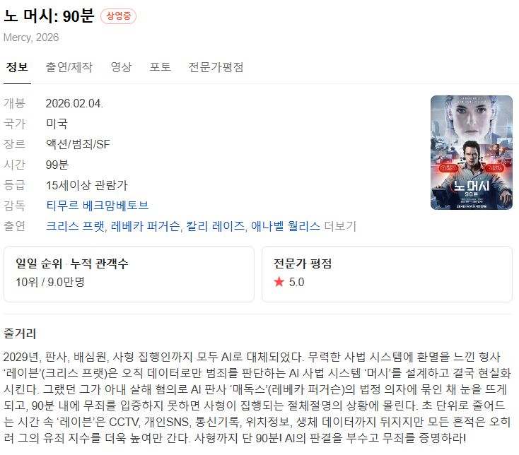 movie 영화 노 머시 90분 노 머시, 90분 Mercy.2026.4K person mo*** calendar_today 2026.01.01 visibility 3,402 다운로드 2개 파일 folder_zip Mercy.2026.2160p.iT.WEB-DL.DV.HDR10.mp4 18.2 GB download folder_zip Mercy.2026.2160p.iT.WEB-DL.DV.HDR10.smi download