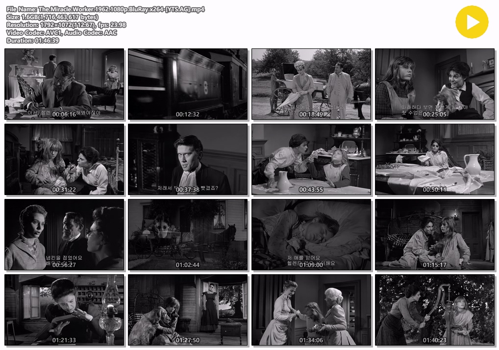 movie 영화 미라클 워커 Miracle 미라클 워커.The Miracle Worker... person 자료*** calendar_today 2026.03.29 visibility 5,155 시청각 장애인 헬렌 켈러와 도전 정신을 심어준 설리반 선생의 이야기다. 이 영화는 아서 펜이 패티 듀크와 앤 밴크로프트와 함께 만든 '헬렌 켈러' 이야기의 최종판. 이미 브로드웨이와 텔레비전 시리즈로 대성공을 거둔 작품이다. 언제 들어도 깊은 울림을 주는 휴먼 스토리에 권위와 편견에 도전하는 헬렌과 설리반의 강한 성격이 가미돼 자칫 늘어질 수 있는 스토리를 놓치지 않는다. 다운로드 2개 파일 folder_zip The.Miracle.Worker.1962.1080p.BluRay.x264-[YTS.AG].mp4 1.6 GB download folder_zip The.Miracle.Worker.1962.1080p.BluRay.x264-[YTS.AG].smi download