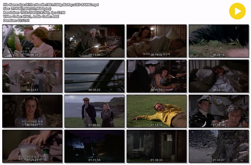 movie 영화 바늘구멍 Eye Needle 바늘구멍.Eye of the Needle.198.. person 자료*** calendar_today 2026.03.29 visibility 5,643 영자막도 함께 올립니다. 2차 세계대전이 끝날 무렵 '바늘 구멍'이란 암호명을 가진 독일 스파이 헨리 파버(도널드 서덜랜드)는 연합군의 중요한 정보를 가지고 히틀러에게 가던 도중 배가 부서지는 바람에 외딴 섬으로 흘러 들어간다. 이 작은 섬에 사는 사람은 등대지기 부부와 아들이 전부. 다리를 잃은 후 알코올 중독에 빠져 허송세월을 보내고 있는 남편에게 화가 난 아내 루시(케이트 넬리건 분)는 새로이 등장한 헨리에게 호감을 보이는데... 다운로드 3개 파일 folder_zip Eye.Of.The.Needle.1981.1080p.BluRay.x265-RARBG-Eng.srt 1.7 GB download folder_zip Eye.Of.The.Needle.1981.1080p.BluRay.x265-RARBG.mp4 download folder_zip Eye.Of.The.Needle.1981.1080p.BluRay.x265-RARBG.srt download