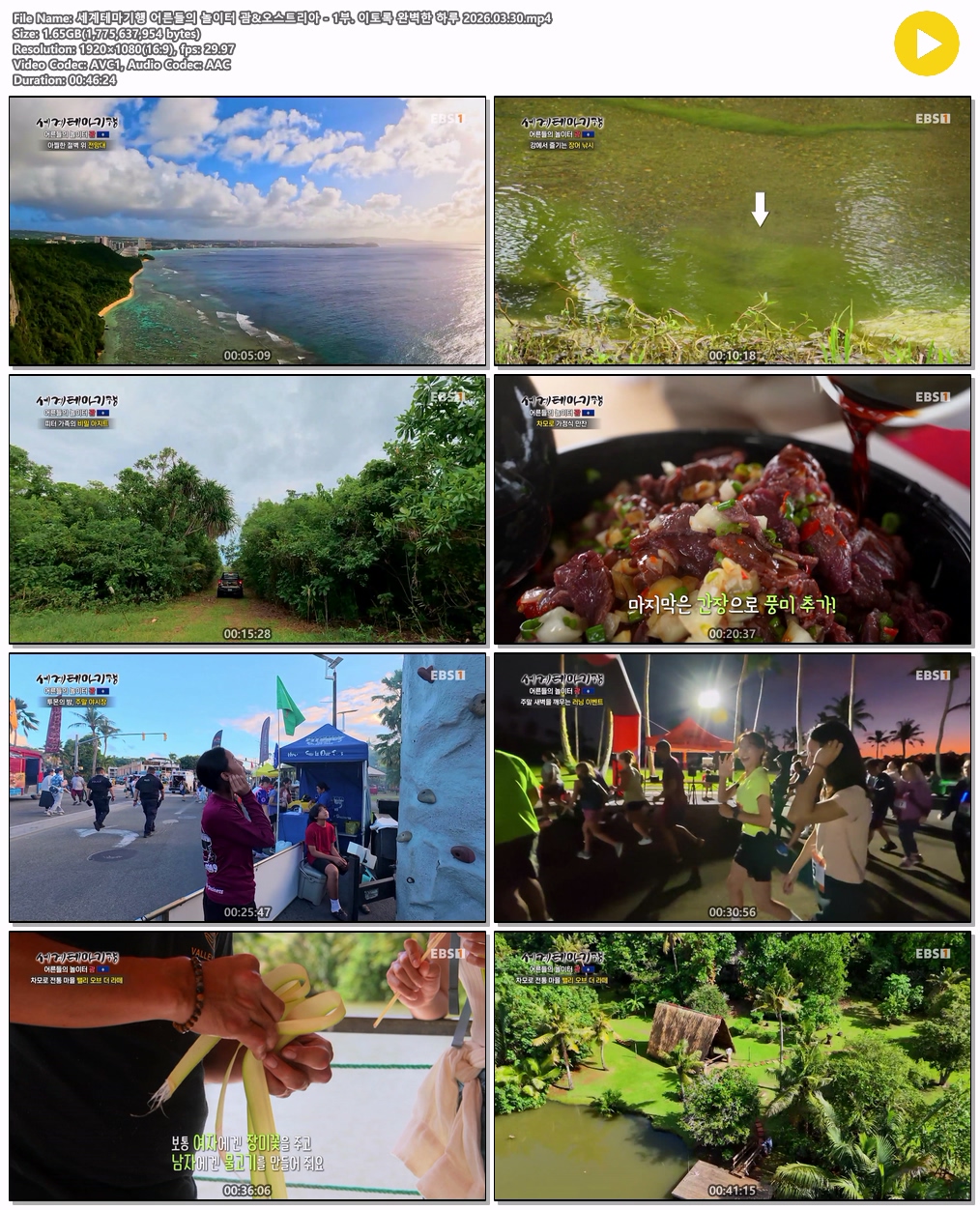 play_circle 동영상 세계테마기행 어른들의 놀이터 세계테마기행 어른들의 놀이터 괌&오스트리아 - 1부. 이토록 완벽한 하루 2026.03.30 person tm*** calendar_today 2026.03.30 visibility 5,625 다운로드 1개 파일 folder_zip 세계테마기행 어른들의 놀이터 괌&오스트리아 - 1부. 이토록 완벽한 하루 2026.03.30.mp4 1.7 GB download