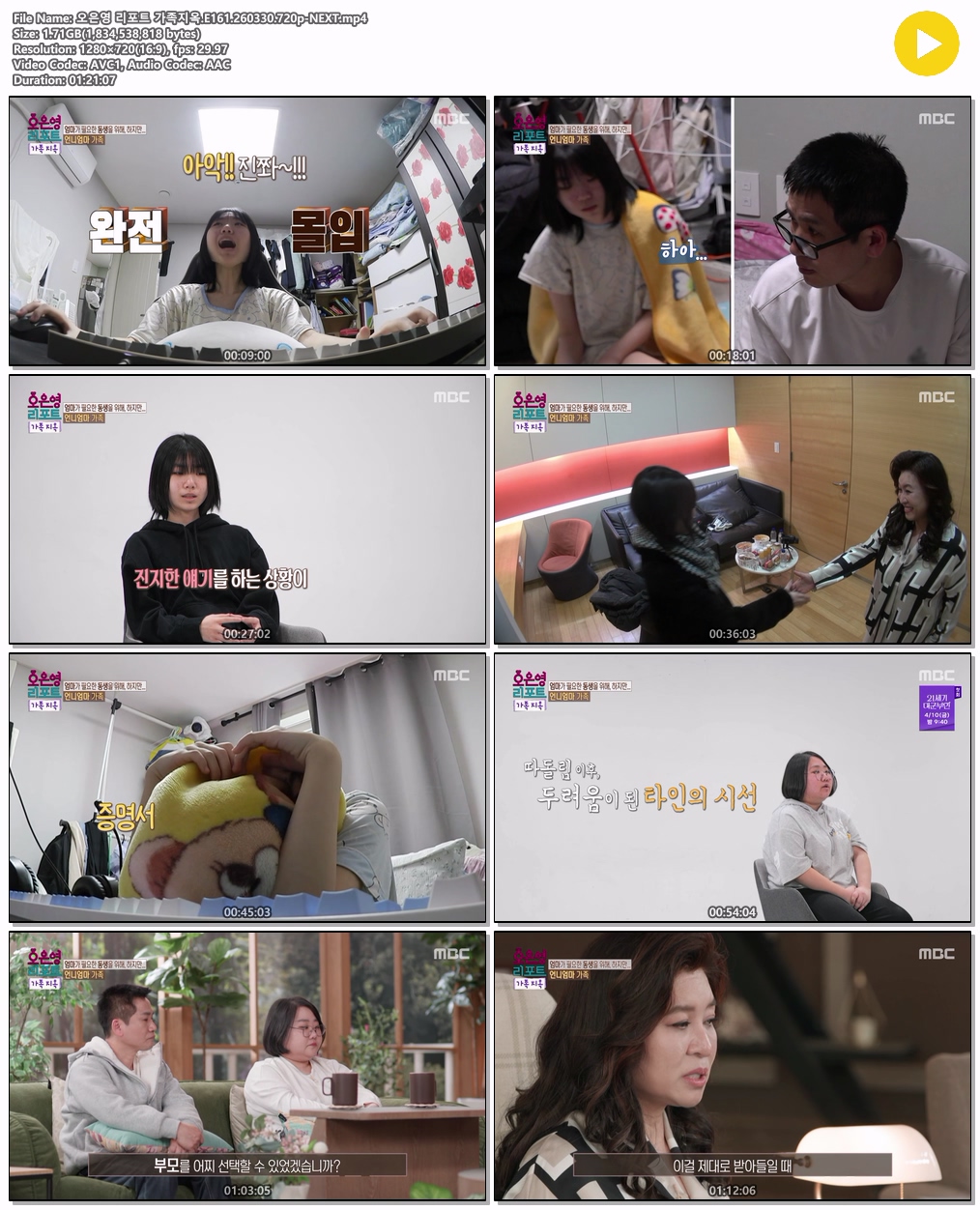 play_circle 동영상 오은영 리포트 가족지옥 오은영 리포트 가족지옥.E161.260330.720p-NEXT person tm*** calendar_today 2026.03.30 visibility 6,437 다운로드 1개 파일 folder_zip 오은영 리포트 가족지옥.E161.260330.720p-NEXT.mp4 1.7 GB download